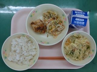 麦ごはん、枝豆サラダ、鶏にら丼、すまし汁、牛乳