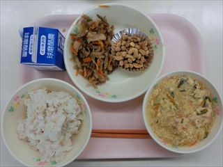 麦ごはん、こくとうナッツ、しょうがいり金平、親子丼、