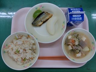 しょうがごはん、サンマの塩焼き、なし、ぶた汁、牛乳