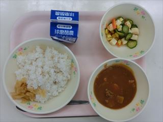 麦ごはん、ふくじんづけ、とうふサラダ、ポークカレー、