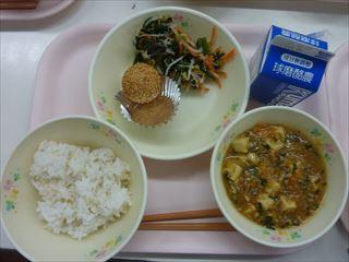 《セレクト給食》麦ごはん、マーボーどうふ、ナムル、春巻き又はごま団子、牛乳 *「はるまき」、「ごま団子」のセレクト給食です。