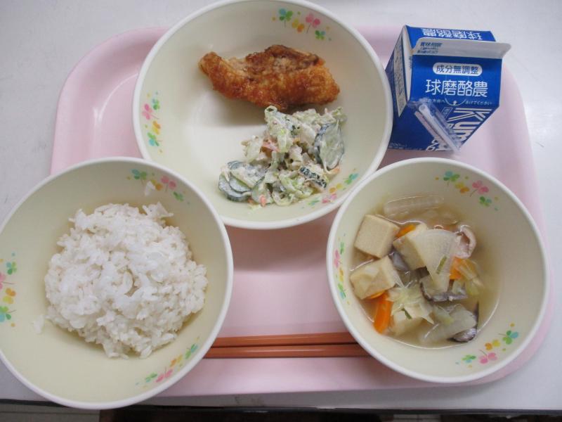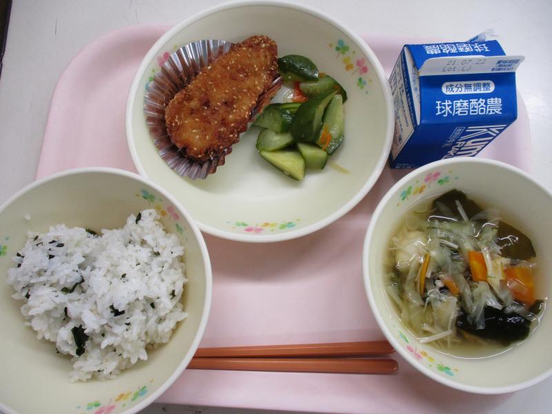 わかめごはん、すまし汁、あじフライ、きゅうりのそくせき漬け、牛乳