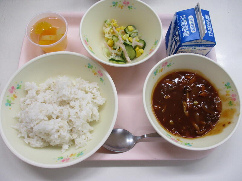 麦ごはん、夏野菜カレー、ふくじんづけ、とうふサラダ、牛乳