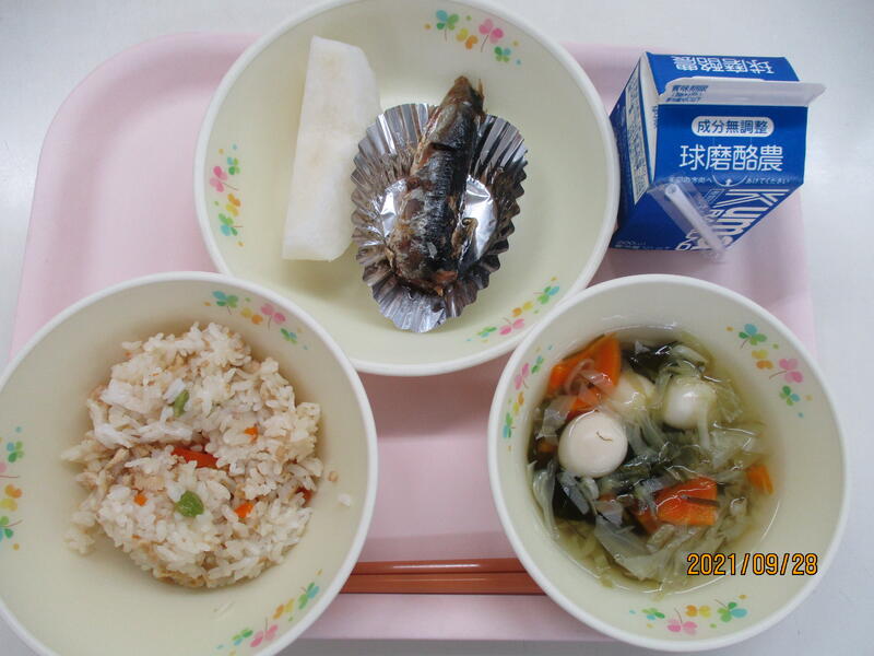 こぎつねご飯、うずらの卵のすまし汁、いわしのおかか煮、なし、牛乳
