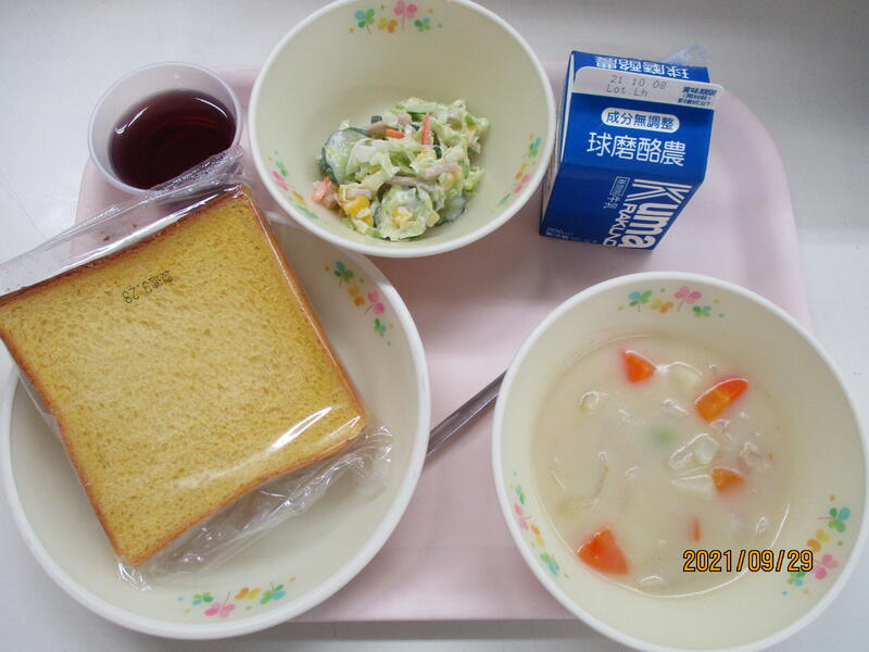米粉入り人参パン、クリームシチュー、シーザーサラダ、ぶどうゼリー、牛乳