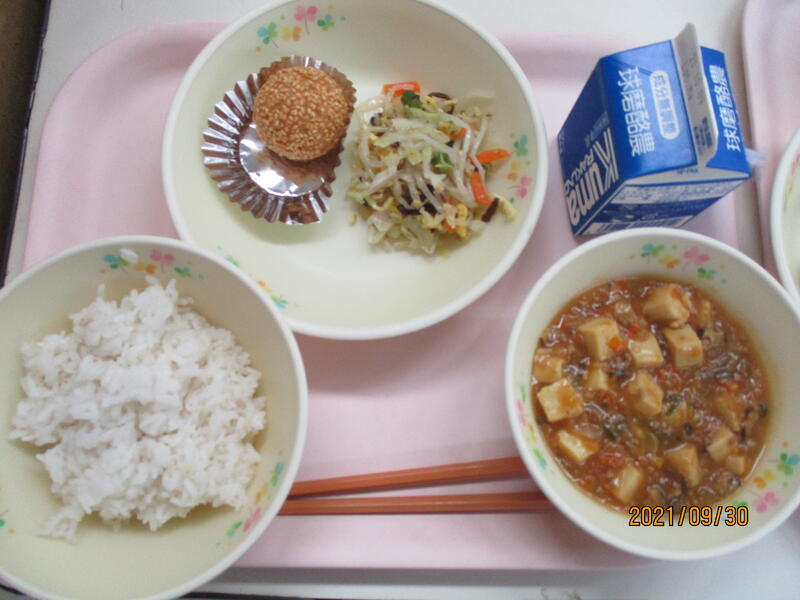 麦ごはん、マーボー豆腐、中華サラダ、中華ごまだんご、牛乳
