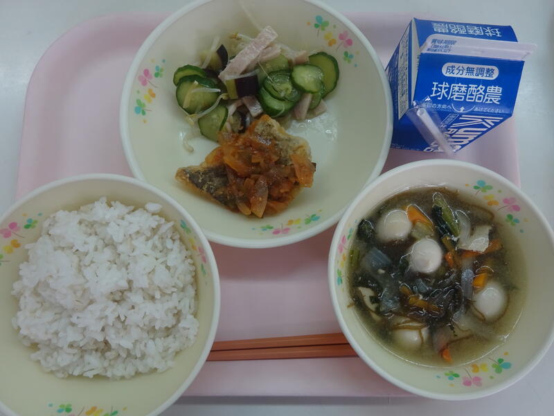 麦ごはん、もずくスープ、魚のチリソース、なすの中華和え、牛乳
