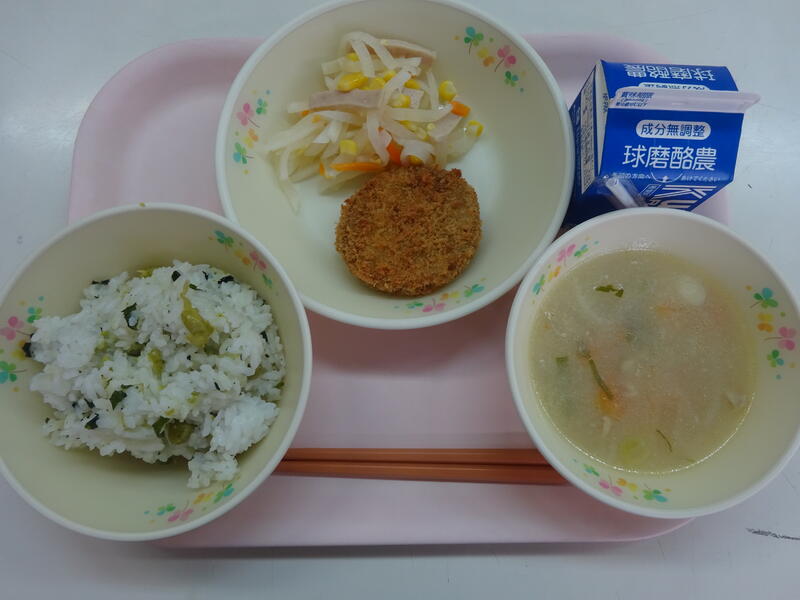 ピースわかめごはん、さつま汁、メンチカツ、春大根のサラダ、牛乳