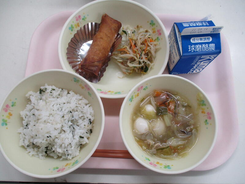 わかめごはん、タイピーエン、春巻き、もやしのナムル、牛乳