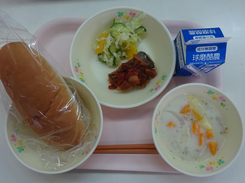 コッペパン、ビーンズシチュー、魚のトマトソースかけ、甘夏サラダ、牛乳