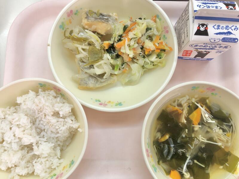 麦ごはん、牛乳、手作りみそ豚、いんげんのごま和え、