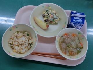 そぼろごはん、りんご、ビーンズサラダ、肉団子と白菜のスープ、牛乳