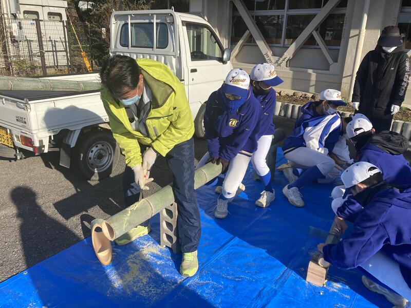 学校運営協議会委員の上村正雄様、久村昌司様のご指導のもと、正門に立派な門松が完成しました。門松づくりには、生徒会執行部をはじめ、各部活動などの有志、総勢40名以上の生徒が参加しました。今年1年間に感謝をし、来年希望に満ちた新たな1年がスタートしますように。