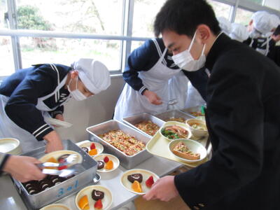 本日は3年生が最後に食べる給食の日。お祝いメニューで「ランチバイキング」を行いました。