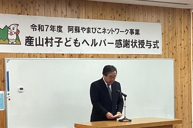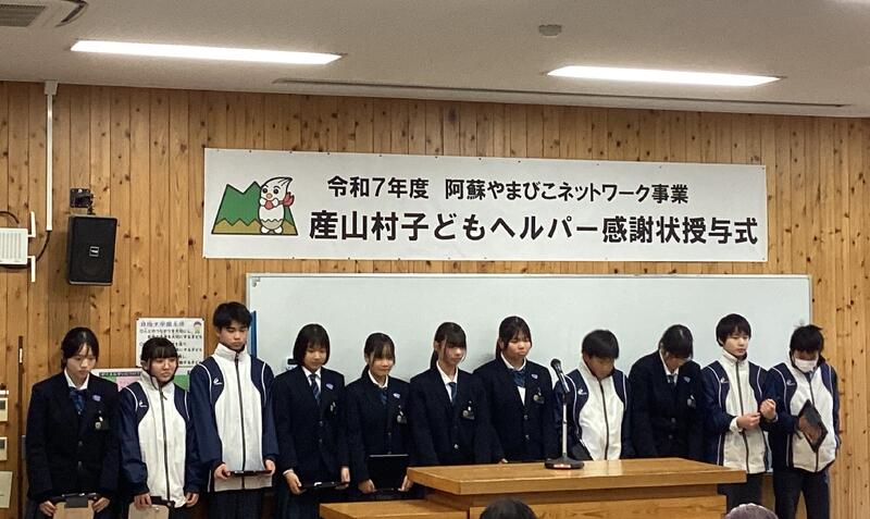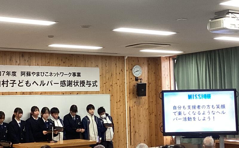 本日は村社会福祉協議会会長の産山村村長様、副会長の産山村議会議長様、村教育長様、他多数の来賓の皆様方やヘルパー活動にご協力をいただいた村民の方々をお招きして、「子どもヘルパー活動報告会・感謝状授与式」を執り行いました。