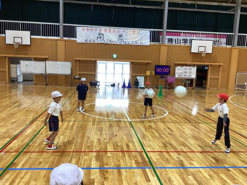 1~2年生の体育です。ソフトバレーボールをワンバウンドさせて、パスを続けています☆