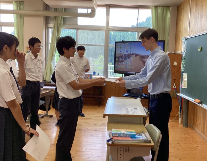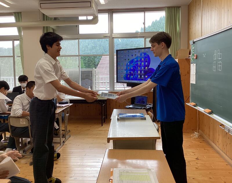 代表の学園生が、新しい村長様から表彰状の授与を受けました☆
