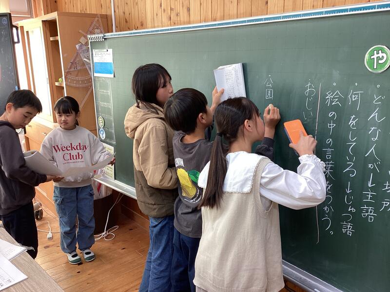 4年生です。国語の授業です。「漢字の広場」の学習で、挿絵中の言葉を使って、主語・述語の入った文章を作成しています☆