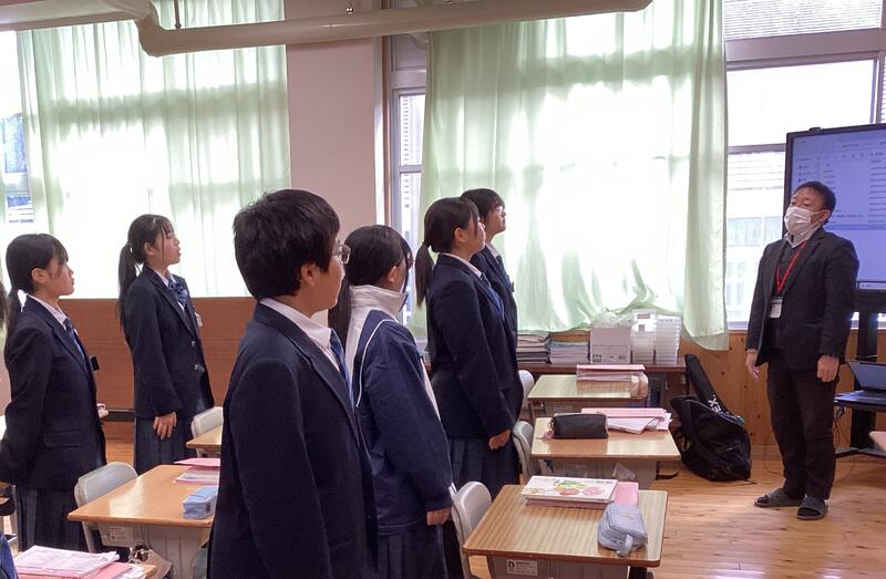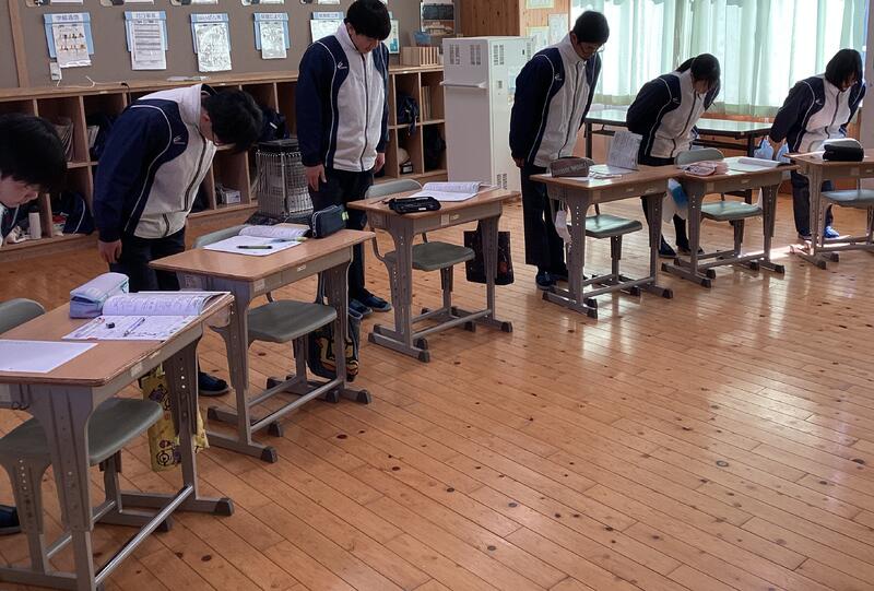 8年生です。給食後10分間の昼勉を終え、挨拶をしています。みんなきりっとしていました☆