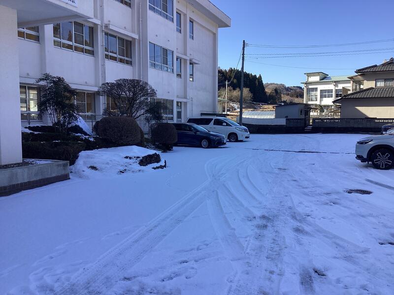 学園に到着すると、あまり日があたらい駐車場の方はまだ積雪が見られます・・・