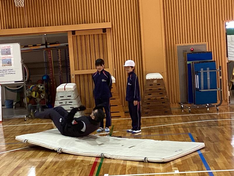 3年生です。マット運動で指導をする教頭先生がお手本を示されています☆
