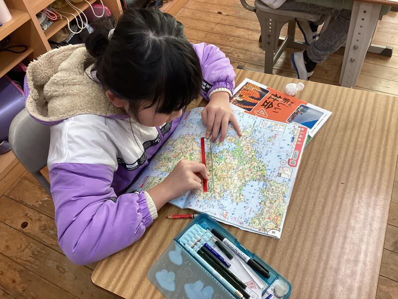 4年生です。社会科で地図帳を使って、長さを測り、縮尺による実際の長さをイメージしています☆