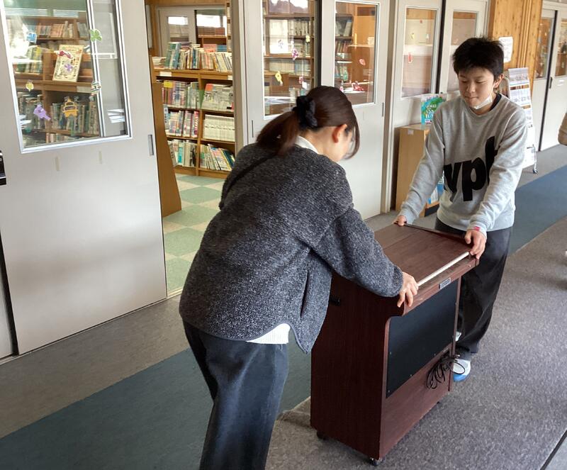 6年生です。音楽担当の先生と一緒に楽器を運んでいます☆