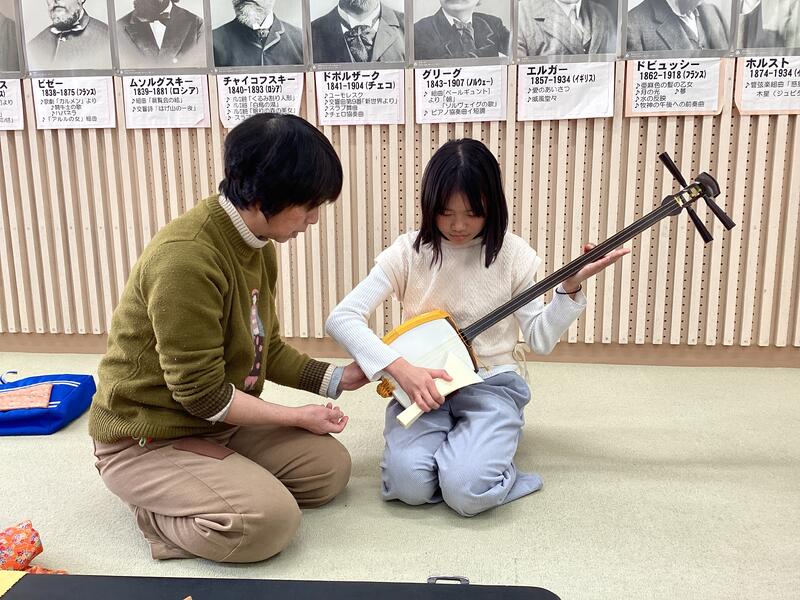 講師は、本学園1年生の担任の〇〇先生です。 まずは実際に三味線を弾いていただきました☆