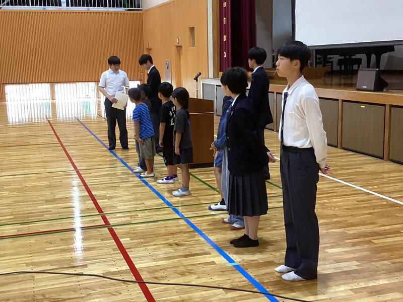 まず、村が募集した「人権メッセージ・標語」の優秀作品の表彰が行われました。本学園から学年1名ずつの9名が選出されました。9名は名前を呼ばれ、その場に起立しています☆