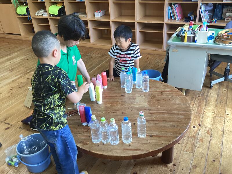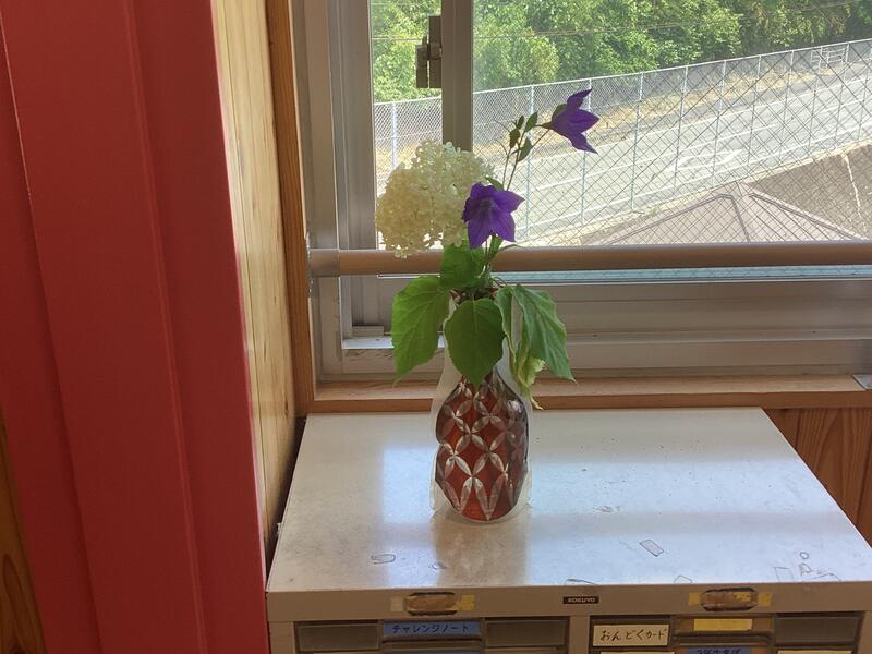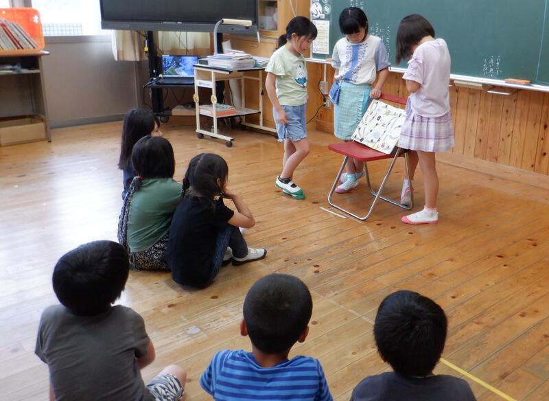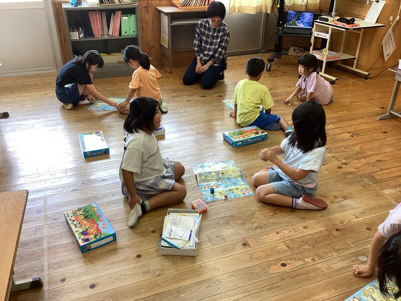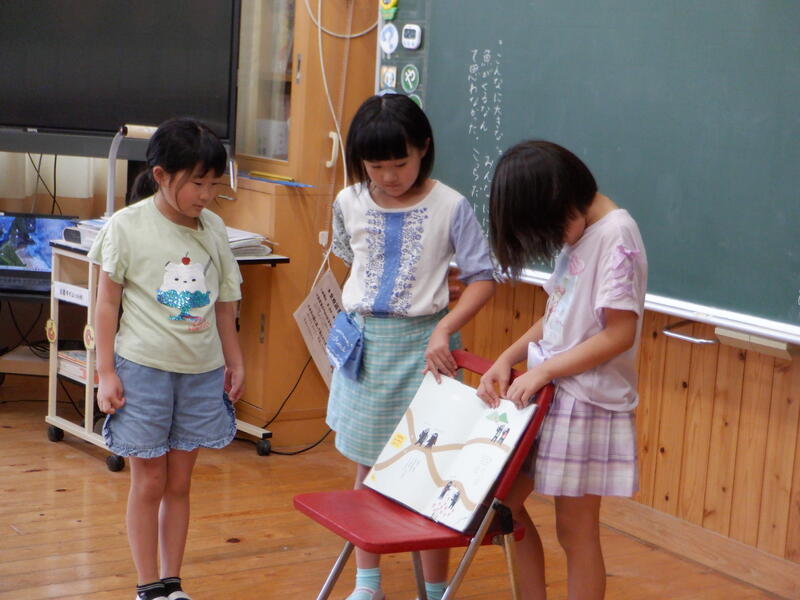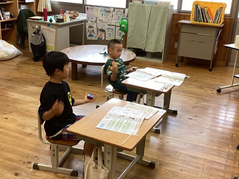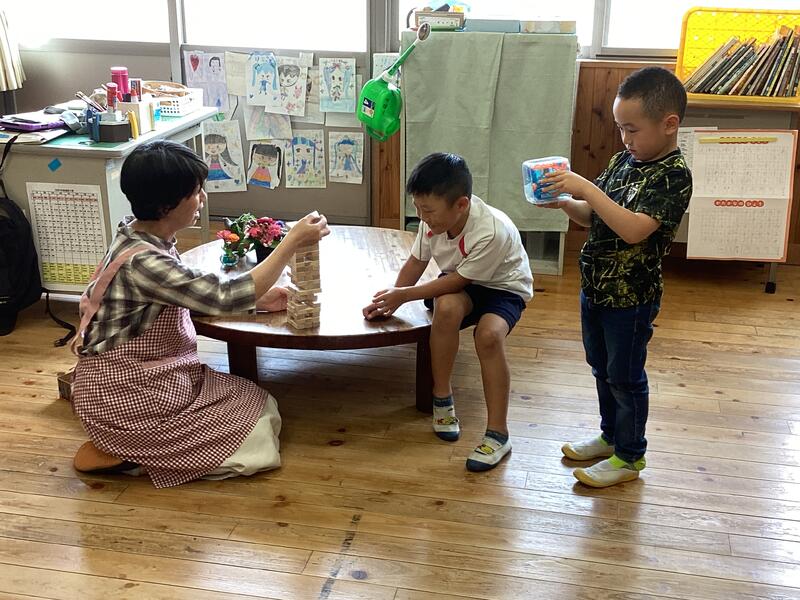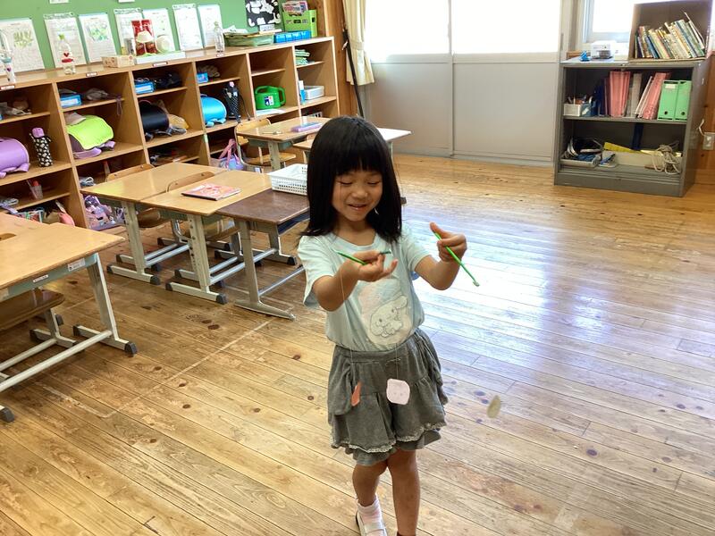 1年生教室です。2年生と4年生、そして1年生の担任の先生で、折り紙遊びです☆