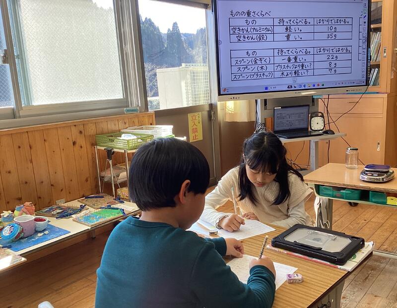 3年生です。理科の「ものの重さくらべ」をペアで行っています☆