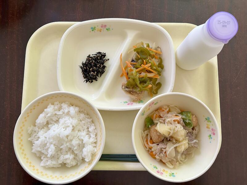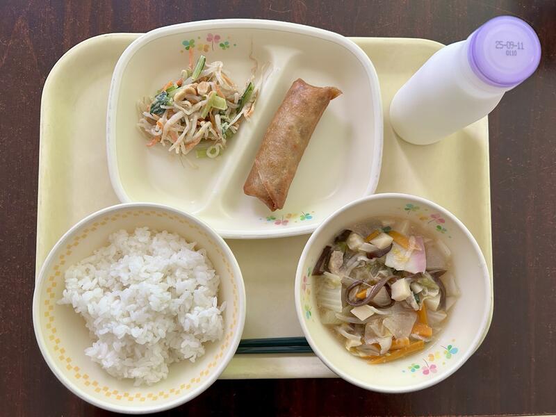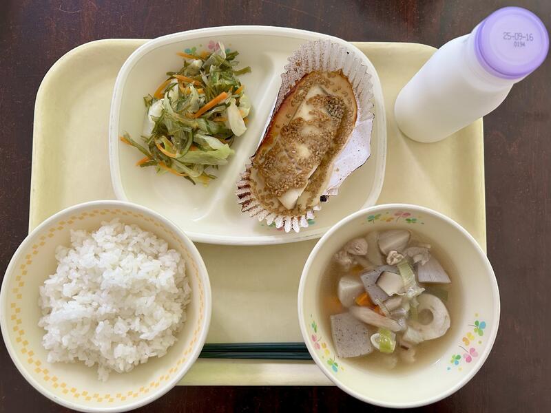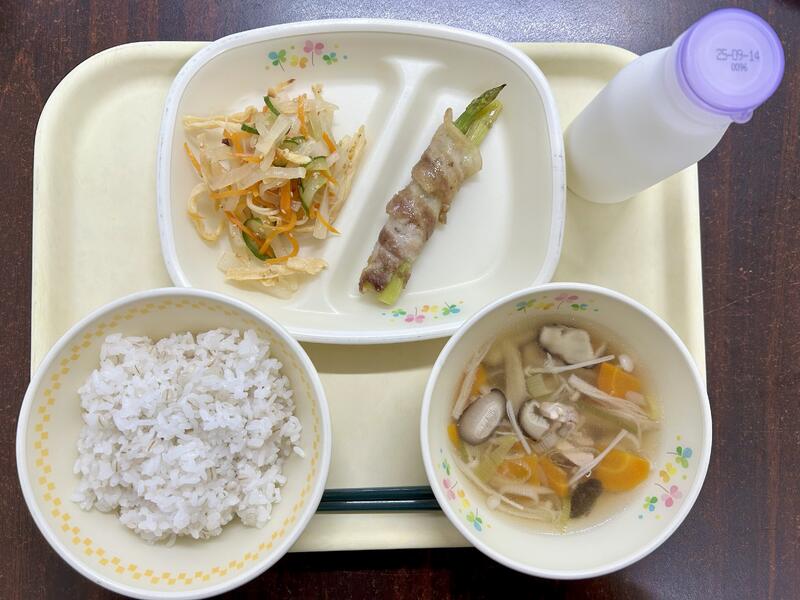 麦ごはん、牛乳、アスパラガスの肉巻き、かみかみするめあえ、鶏ごぼう汁です。