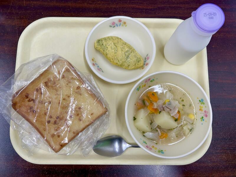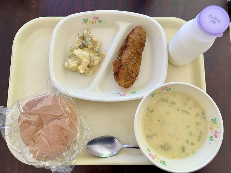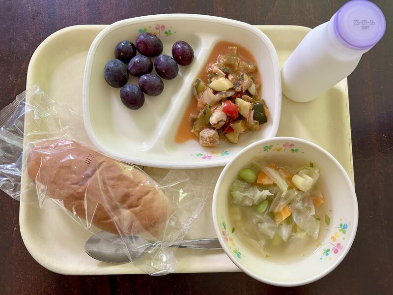 コッペパン、 牛乳、チキンラタトゥイユ、コンソメスープ、果物(ぶどう)です。