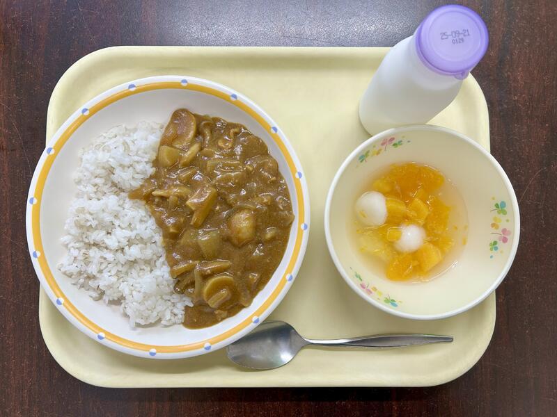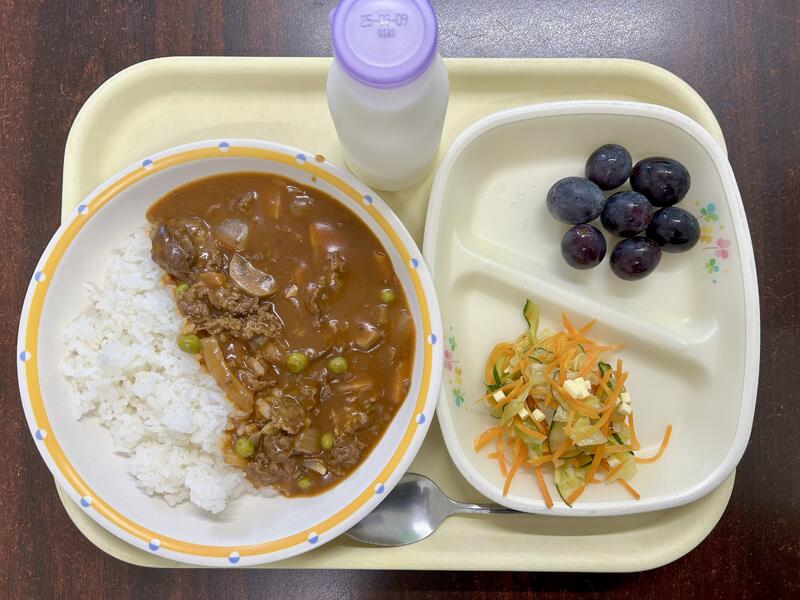 たっぷりトマトのハヤシライス、牛乳、カルシウムサラダ、果物(ぶどう)です。