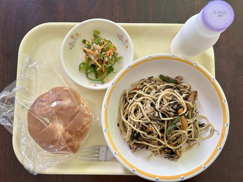 パインパン、、牛乳、ひじきスパゲティ、ピーマンのツナあえです。