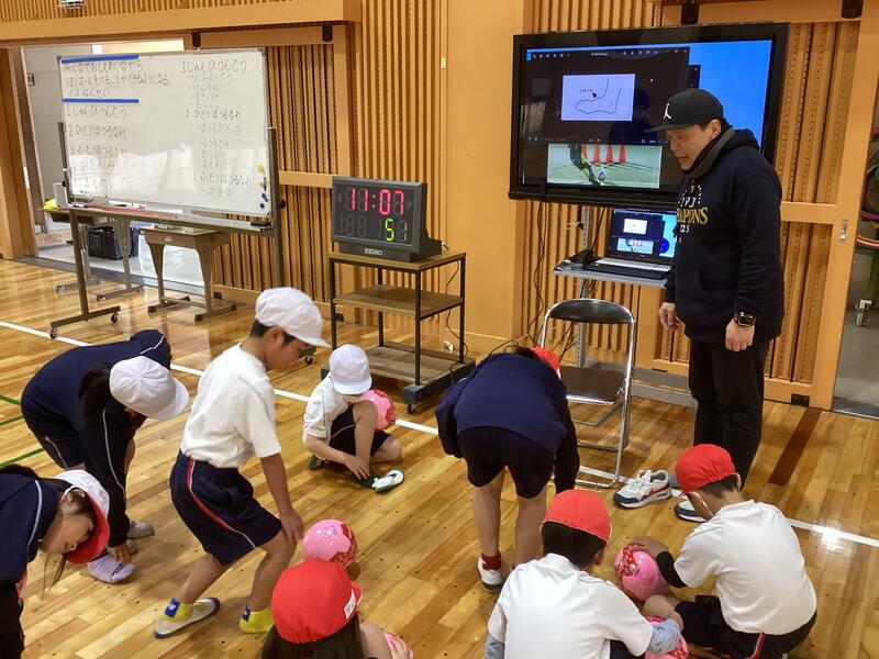 1~2年生です。まず「ボール蹴り」のコツ(どこで蹴るか)を先生と一緒に画像で確認しています☆