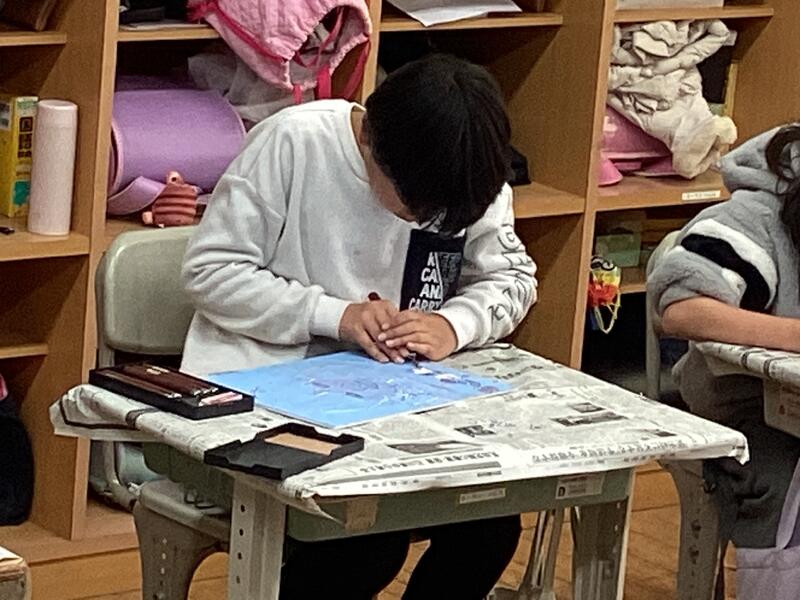 4年生の図工の木版画の授業。彫りの段階に突入です☆