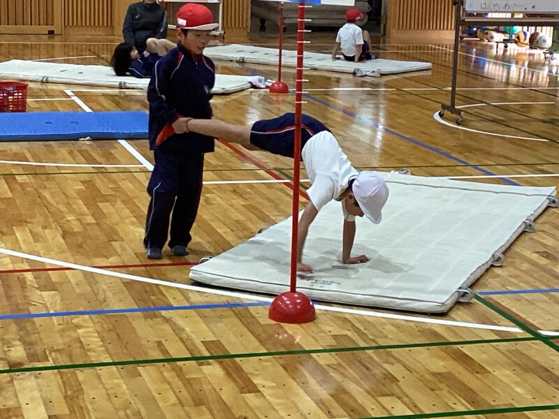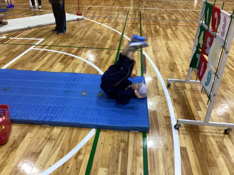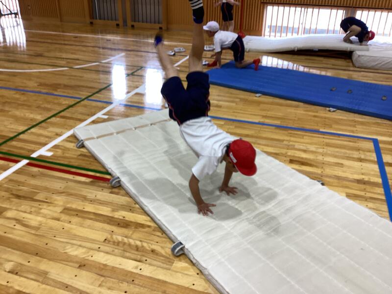 1~2年生の体育です。マットを使った運動遊びの授業です。いろいろな運動に取り組んでいます☆