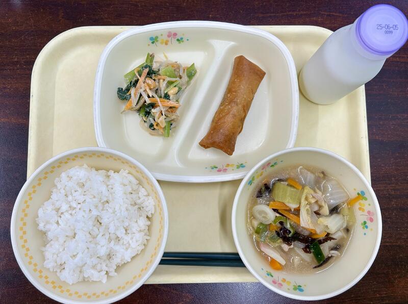 ごはん、牛乳、春巻き、小松菜のピーナツあえ、八宝菜です。
