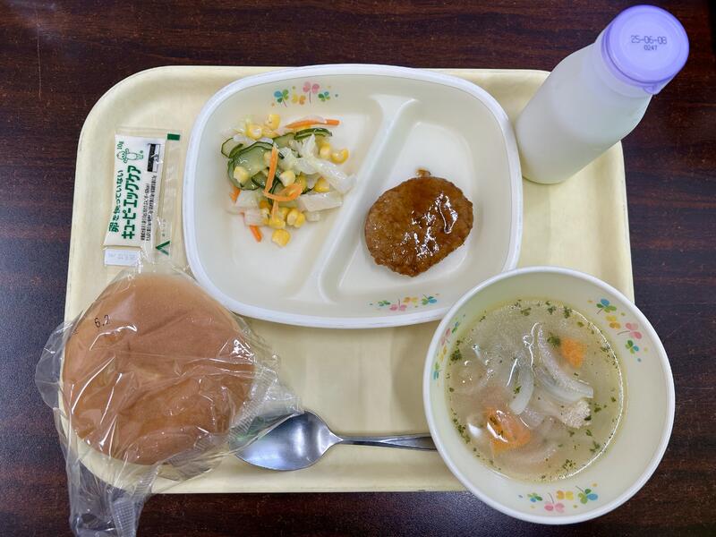 てりやきチキンバーガー、牛乳、キャベツのフレンチサラダ、オニオンスープです。