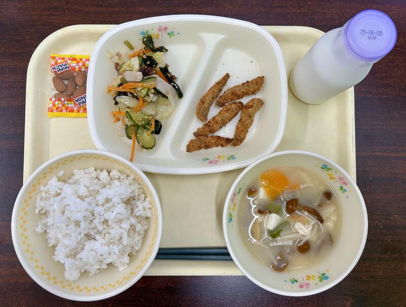 麦ごはん、牛乳、いわし梅のかおり揚げ、海藻サラダ、豆腐となめこのみそ汁、一食アーモンドです。
