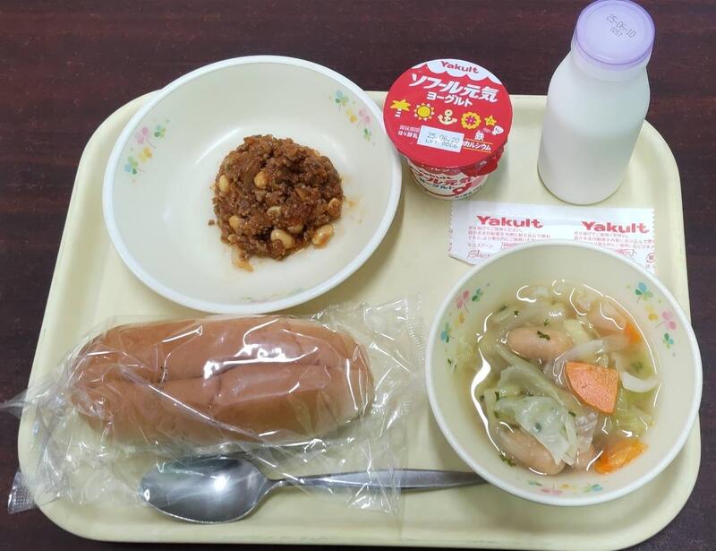コッペパン、牛乳、チリコンカン、野菜のスープ煮、ヨーグルトです。