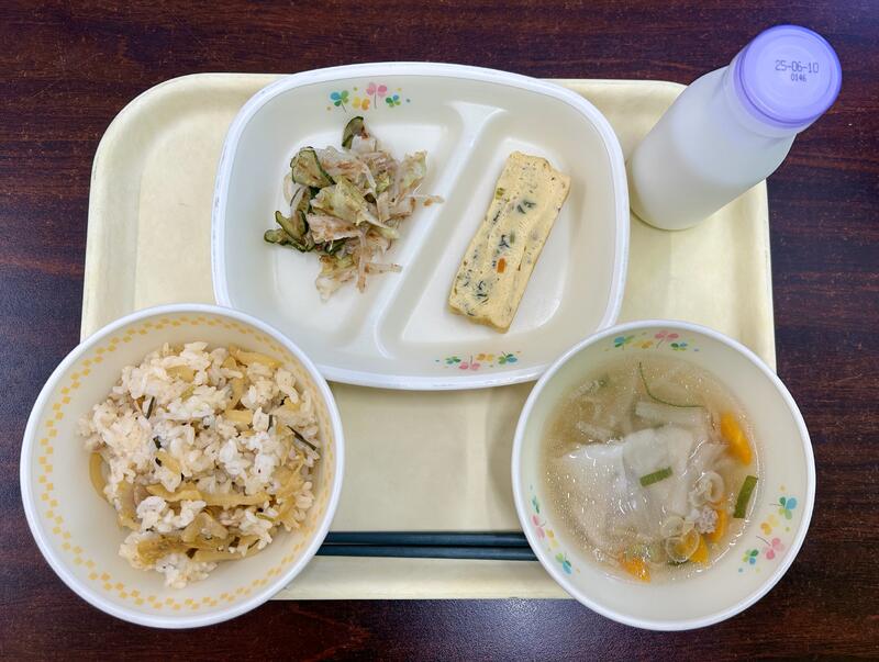 キムタクごはん、牛乳、ちぐさやき、梅肉あえ、ワンタンスープです。
