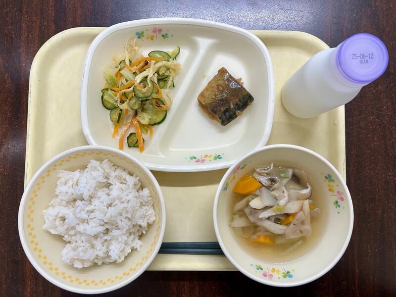 むぎごはん、牛乳、さばのみそ煮、かみかみするめあえ、こんさい汁です。