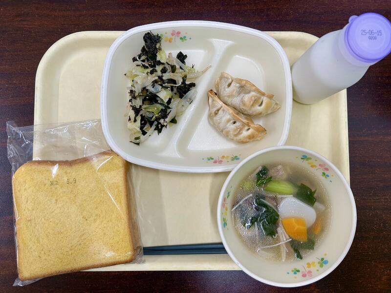米粉入りにんじんパン、牛乳、焼きぎょうざ、わかめのチョレギサラダ、トックスープです。