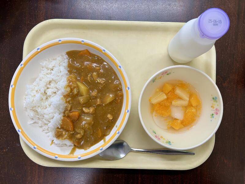 チキンカレーライス、牛乳、フルーツしらたまです。