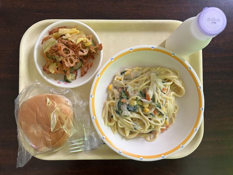 パインパン、牛乳、白菜クリームスパゲティ、れんこんチップスサラダです。