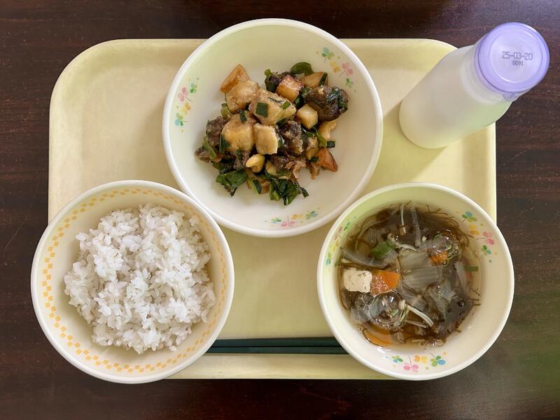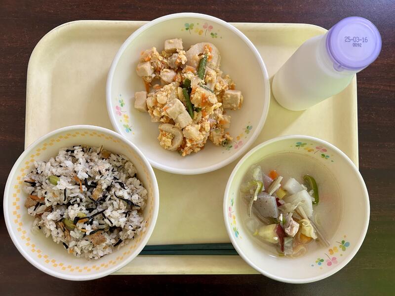 ひじきごはん、牛乳、高野豆腐の卵とじ、さつま汁です。