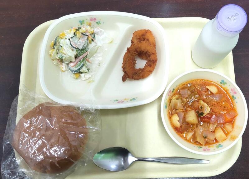 米粉パン、牛乳、いかリングフライ、シーザーサラダ、ミネストローネです。