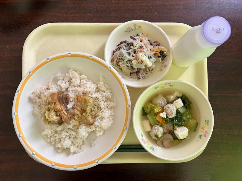 カオマンガイ、牛乳、大葉入り春雨サラダ、肉団子スープです。